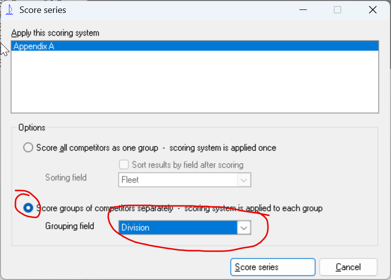 Then for for Division A edit there start in each race and enter the race length and the same for Division B. I presume that you have already set-up the scoring changes from the default scoring system for each Division.